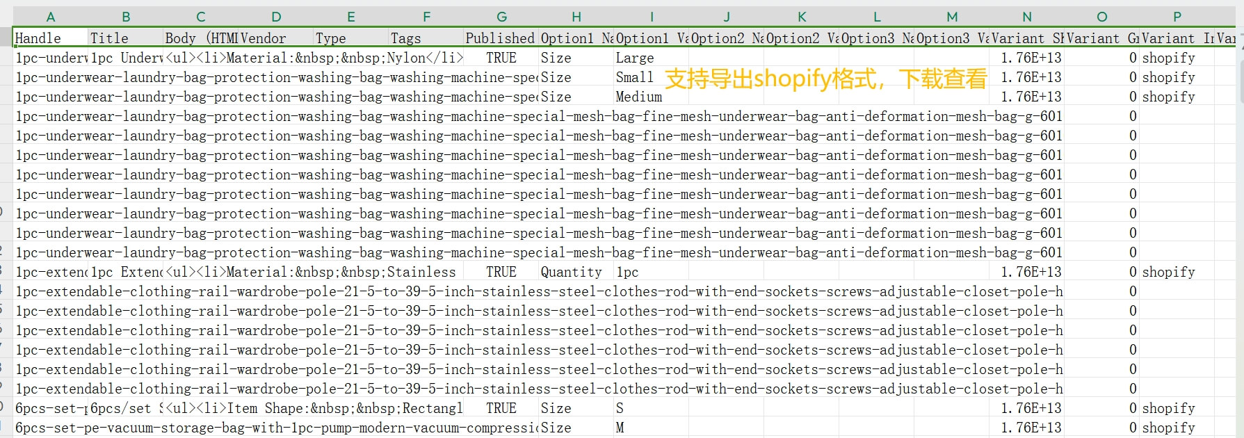(以上是shopify格式导出,可以直接上架到shopify,点击下载查看)