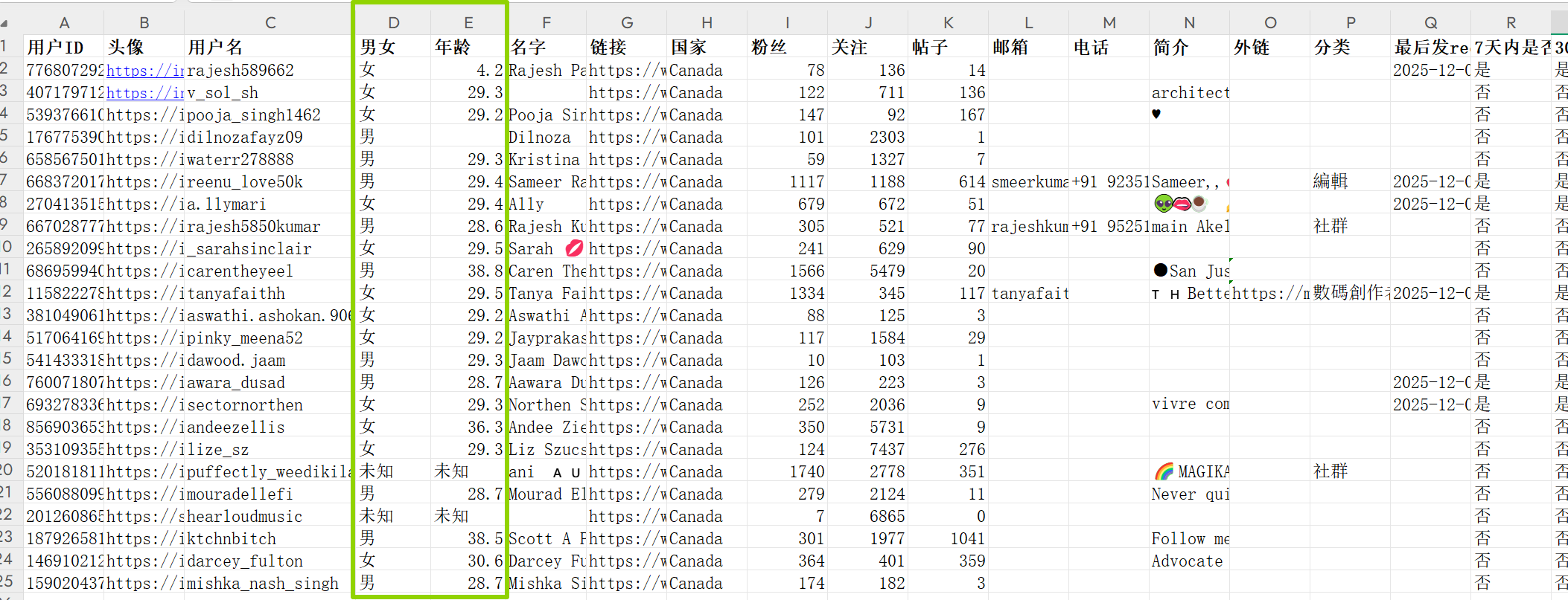 支持用户ID、头像、用户名、名字、链接、国家、粉丝、关注、帖子、邮箱 、电话、简介、外链、分类、最后发reels时间、7天内是否活跃、30天内是否活跃、否为营销号、is_business、is_verified、is_private采集